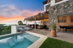 This elegant property features a three-bedroom main villa plus a private bungalow available upon request. Each bedroom features its own palapa terrace, creating private, breezy spaces for relaxation. Guests can enjoy a climate-controlled infinity pool, a telescope for stargazing, and spacious indoor-outdoor living areas designed for both entertainment and tranquility.